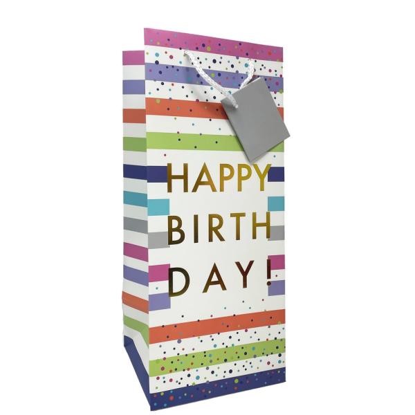 Printed paper bag with rope handles and peggable plastic hook. Fits 1.75 liter (half gallon) bottles.