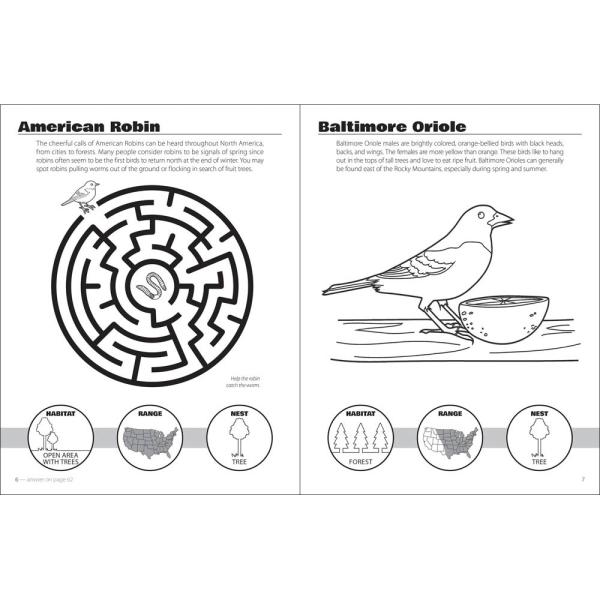Coloring pages present facts such as the birds' colors and diets, where they live, and where you are most likely to see them. Activities like mazes, word finds, and dot-to-dots reinforce the information in unique and creative ways. Plus, the Birds & Friends Activity Book offers suggestions for family activities, from making a birdbath to going on a bird hike.