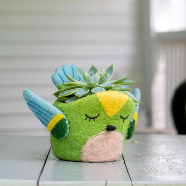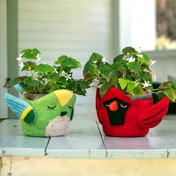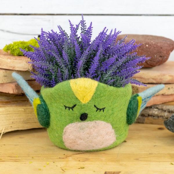This charming hand felted hummingbird planter is sized for 4" potted plants or as a fun tabletop container. It is made by skilled artisans working in a fair trade production center in Kathmandu, Nepal. Water will wick through the natural wood fibers so be sure to place a dish inside or outside the planter if used indoors. However, wool breaths and will also dry out naturally. Don't miss the cute little tail at back! Comes with our attractive Fair Trade Home & Garden tag.