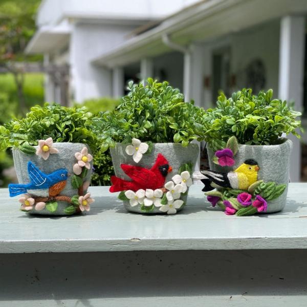 This sophisticated woolen pot can hold all kinds of things, including potted plants up to 5.5"dia. It is made by skilled artisans working in a fair trade production center in Kathmandu, Nepal. Water will wick through the natural wood fibers so be sure to place a dish inside or outside the planter if used indoors. However, wool breaths and will also dry out naturally. Don't miss the cute little tail at back! Comes with our attractive Fair Trade Home & Garden tag.