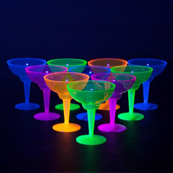 12 Disposable plastic assorted neon 12 oz Margarita Glasses. Comes in 2 separate pieces. Bring a little color to your party, perfect for black light parties, pool parties, picnics and much more