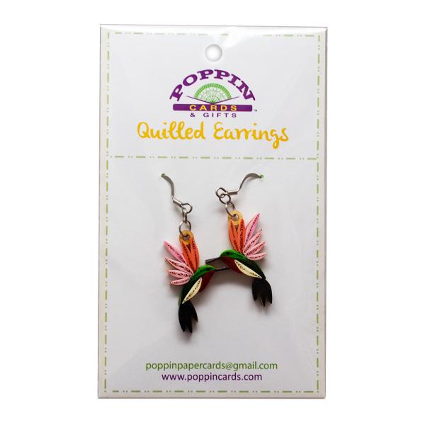 Quilling is an art form that involves the use of strips of paper that are rolled, shaped, and glued together to create decorative designs. The paper is wound around a quill to create basic coil shapes. The paper is then glued at the tip and these shaped coils are arranged to form flowers, leaves, and various ornamental patterns that you find in our cards. All Poppin Cards & Gifts earrings are handcrafted, they truly are a piece of art!