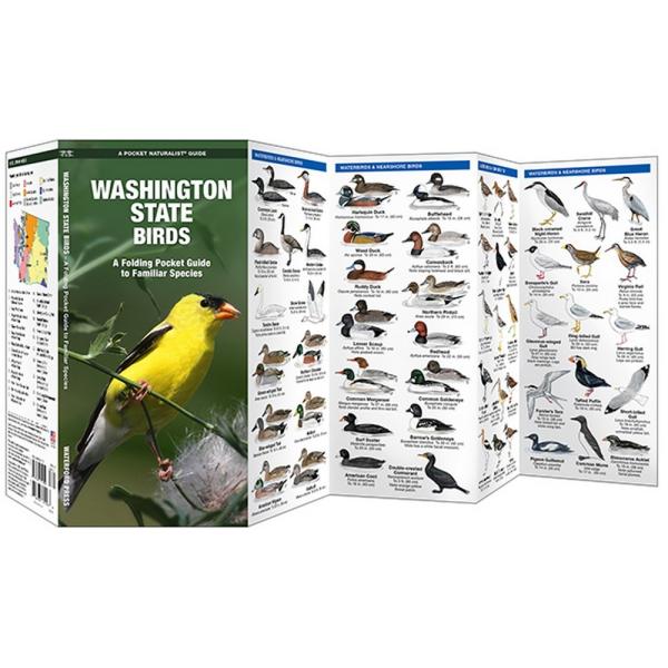Washington State Birds is a portable reference guide featuring the most commonly seen birds in Washington. This pocket-sized, folding guide is printed on laminate material and can be easily carried in the field. A state map highlights birding sanctuaries.