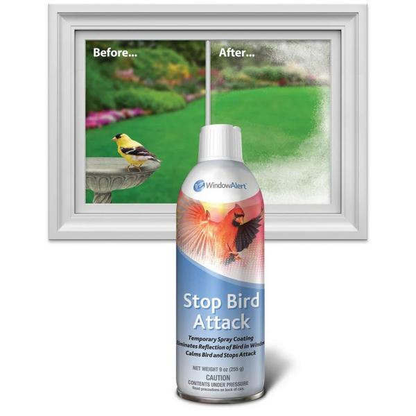 Some territorial birds vigorously defend their territory. These birds perceive their own reflection in a window to be another bird competing for their mate and attack. Repeated attacks deplete a bird's energy, putting its health and nesting brood at risk. Stop Bird Attack eliminates the bird's window reflection, calms the birds, and stops the attack. The product is a removable, white coating that may be sprayed on any window under attack. Stop Bird Attack is effective for Northern Cardinals, American Robins, California Towhees, and other territorial birds. (9 ounce aerosol can) Stop Bird Attack cannot be shipped to Alaska, Hawaii, or international destinations including Canada.