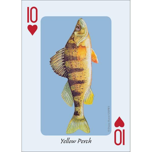 This gorgeous deck features detailed illustrations of 52 of the most common and sought-after fish species of the Midwest states, including the Walleye, Rainbow Trout, Largemouth Bass and more! Anyone who enjoys fishing will love having these playing cards for their favorite games and for quick I.D.