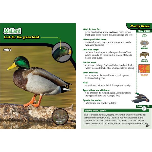 This children's field guide features full-color photographs and information about 87 bird species organized by color to help kids identify birds in Colorado.