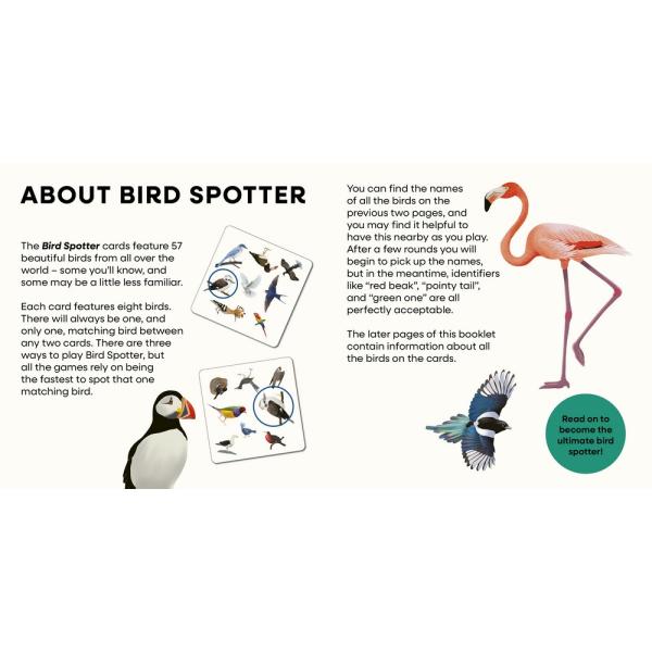To play the game, compare two cards and be first to spot the bird that appears on both. There are three ways to play Bird Spotter, all suitable for 2-8 players, and they all rely on being the fastest to spot that one matching bird.