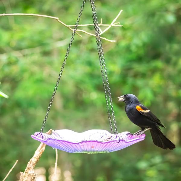 DESIGNED WITH BIRDS IN MIND: Bright, intricate violet begonia flower design catches the eye while the gently sloped edge aides in bird bathing while three-point attachment and durable metal chain provides secure hanging